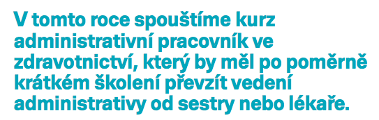 Zatím vše běží ve zkušební verzi. Ze strany nemocnic, ambulancí a dalších zdravotnických zařízení je o administrativního pracovníka zájem. Kurz není nikterak složitý a požadavkem je pouze maturitou ukončené středoškolské vzdělání. První pracovníci vyjdou ze studia někdy v průběhu jara a pak se mohou zapojit do procesu. Je to skutečně v řádech měsíců nebo roku.