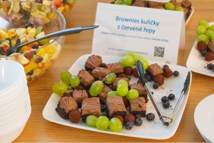 Účastníci si tak mohli pochutnat například na cizrnovém čokoládovém dortíku, který má v porovnání s klasickým dortem 2,5× méně energie, 5× méně tuku, 2× méně cukru a 2× více vlákniny. Recept na cizrnový čokoládový dortík zde: https://www.stobklub.cz/recept/109359/.
