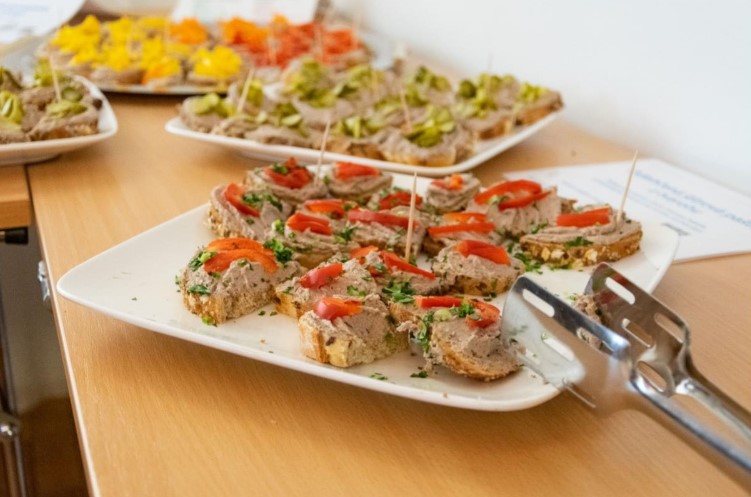 Připraveny byly i chlebíčky a jednohubky s různými pomazánkami. Nejvíce si účastníci chválili játrovou paštiku z tvarohu, které obsahuje 2,5× méně energie a 6× méně tuku než klasická paštika, a přesto všem chutnala. Recept na odlehčenou paštiku zde: https://www.stobklub.cz/recept/120946/.