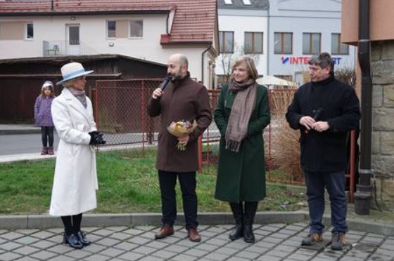 Rožnov pod Radhoštěm, slavnostní odhalení ulice Alice Masarykové, 7. 3. 2024 – autorka návrhu Bára Svátková, vedení MěÚ RpR starosta Jan Kučera, 2. místostarosta Markéta Blinková a 1. místostarosta Tomáš Gross (Zdroj: Facebook města RpR).
