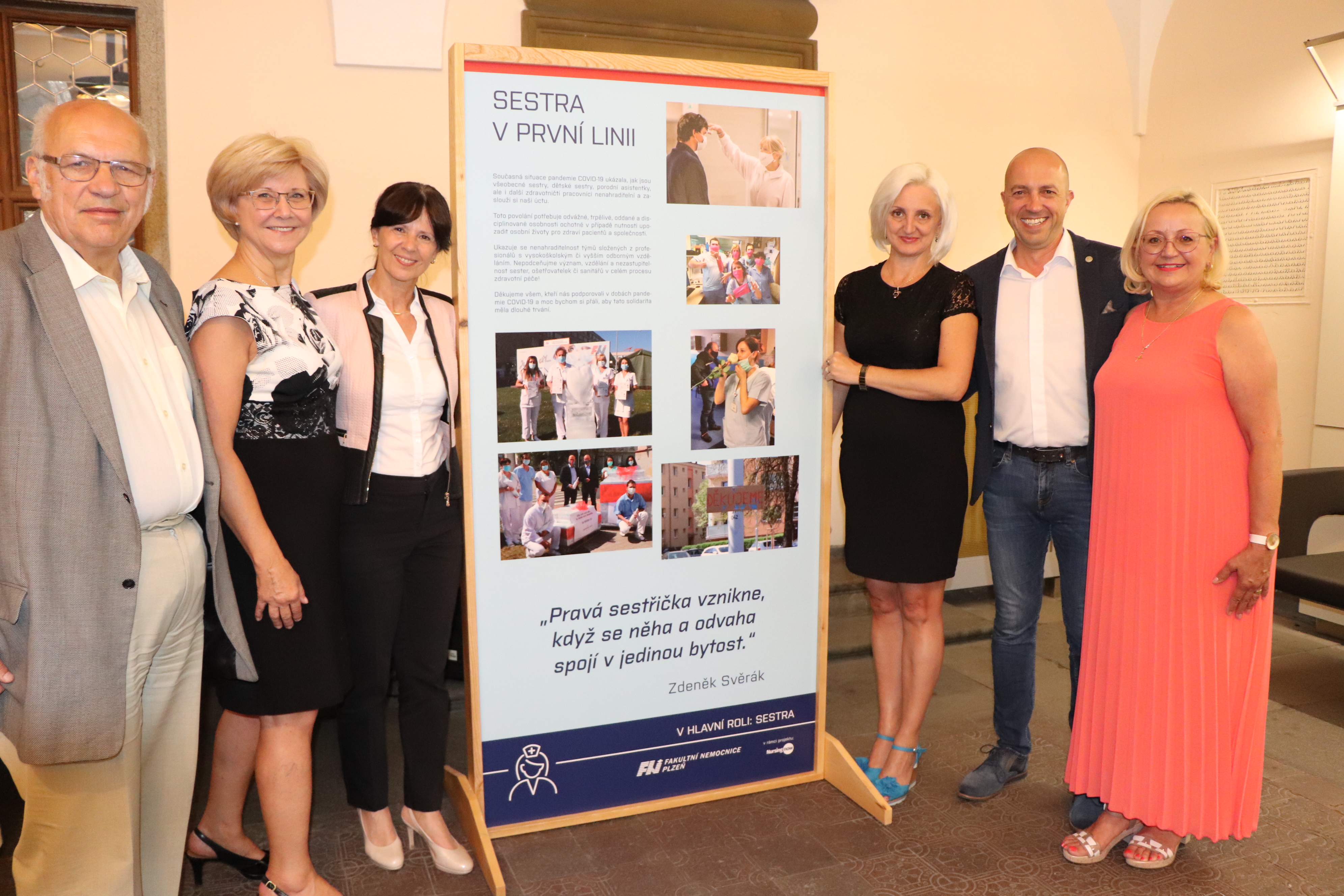 Na fotografii zleva: náměstek pro vědu a výzkum Ondřej Topolčan, emeritní hlavní sestra Nina Müllerová, poslankyně Parlamentu ČR Ilona Mauritzová, náměstkyně pro ošetřovatelskou péči Andrea Mašínová, ředitel FN Plzeň Václav Šimánek, manažerka pro vzdělávání a výuku NELZP Světluše Chabrová.