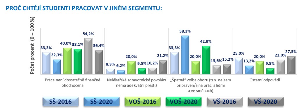 Stále více respondentů plánuje po ukončení svého studia zůstat pracovat v tuzemském zdravotnictví (83 % - 2020). Byl zaznamenán téměř 10% nárůst zájmu o práci v tuzemsku oproti roku 2016 (73,6 %). Přestože jsou lepší platové podmínky dlouhodobě nejčastějším důvodem pro vycestování do zahraničí, tak je patrná lepší platová situace v tuzemsku, kdy došlo meziročně k 5% poklesu respondentů, kteří měli zájem vycestovat do zahraničí za vidinou větších výdělků.