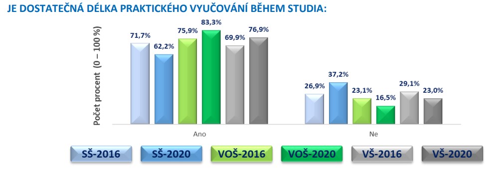 Zejména studenti středních škol v tuzemsku by meziročně uvítali větší množství praktického vyučování během svého studia, aby byli lépe připraveni na následnou praxi. Meziročně byl u těchto studentů zaznamenán téměř 10% pokles spokojenosti s počtem hodin praktického vyučování během studia.