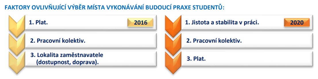 V roce 2020 vstoupila do popředí jistota a stabilita v práci, jakožto nejdůležitější faktor ovlivňující výběr místa vykonávání budoucí praxe studentů. Plat již nebyl primárním faktorem, jako tomu bylo v roce 2016.