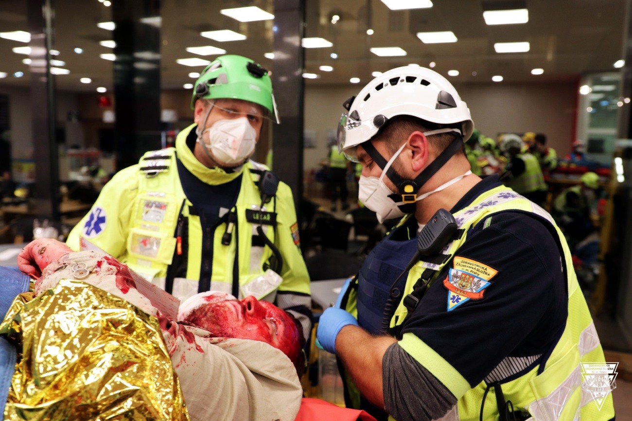 Stejně jako u reálného zásahu museli zdravotníci vyčkat, než jim policie vytyčila bezpečnou zónu pro ošetřování pacientů, které policisté postupně vyváděli či vynášeli z míst, kde ozbrojenci zaútočili. Cvičení se účastnilo 350 figurantů z nichž sedm desítek v rámci scénáře utrpělo zranění, která velmi naturalisticky ztvárnili maskéři pražské záchranky. Na zdravotníky tak čekaly například průstřely, tržné rány a různá devastující poranění. Zasahující posádky si musely poradit také s psychologicky mimořádně náročnými situacemi, jako například s matkou, jejíž dítě se stalo jednou z obětí útoku. Do nemocnic zdravotníci transportovali 69 „pacientů“.