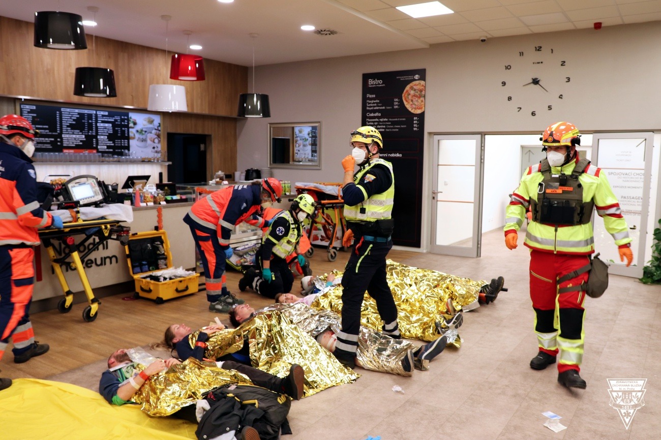 Zdravotníci pražské záchranky a dalších organizací se zapojili do rozsáhlého součinnostního cvičení, které se ve čtvrtek v pozdních večerních hodinách konalo v Nové budově Národního muzea.