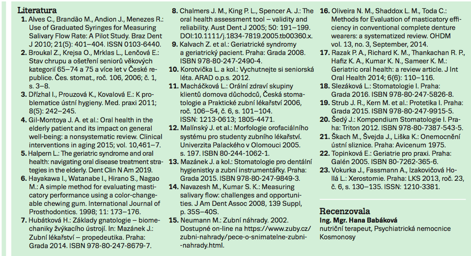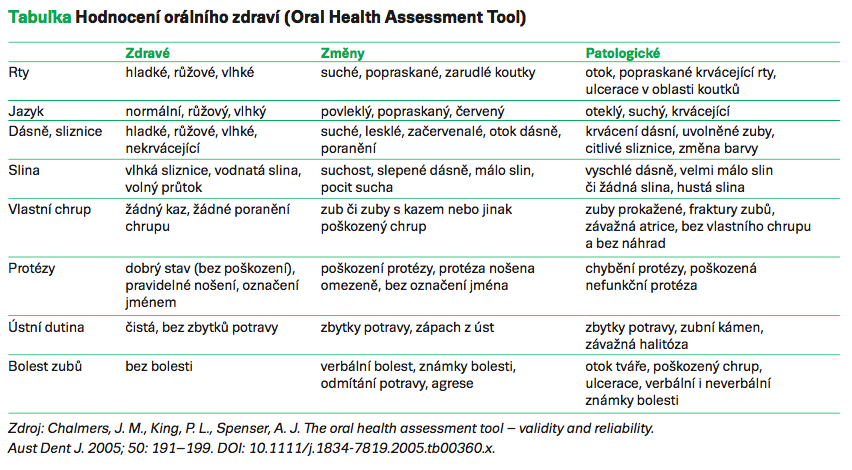 Nedílnou součástí anamnézy je posouzení orálního zdraví geriatrického pacienta. Sebelépevypracovaný jídelníček nemá význam, pokud není pacientschopenpříjmu potravy. Pro posouzení stavu dutiny ústní lze využít tabulku Hodnocení orálního zdraví. V případě, že zjistíte změny,či dokonce patologické stavy,je nutné doporučit pacienta ke specialistovi – stomatologovi nebo k zubní hygienistce. Kontrola a zlepšování ústního zdraví seniorů by mělybýt jedním z klíčových cílů zdravotnického personálu.