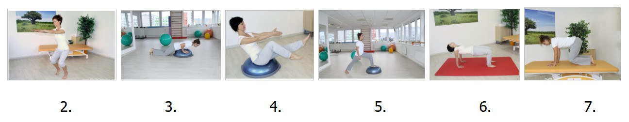 5. Výpady vpřed na obě nohy – vzpřímený stoj, nakročte dopředu jednou nohou (můžete na BOSU nebo jinou labilní podložku) a pokrčte koleno tak, aby nepřesahovalo dopředu před špičku chodidla – střed kolene je nad středem nártu a holeň je kolmo k zemi. Celý trup aktivně napřimujte a vytahujte se za temenem hlavy vzhůru. Plynule se vraťte zpět. Po minutě nohy vystřídejte.