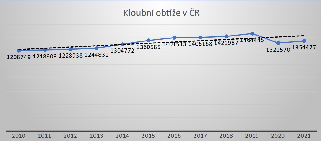 Podle Ústavu zdravotnických informací a statistiky ČR je počet osob, které v roce 2021 vešly do kontaktu se zdravotním systémem z důvodu kloubních obtíží různého charakteru na pozici hlavní diagnózy, celkem 1 354 477 milionu. Oproti roku 2020 vzrostl počet o 32 907 osob. Jedná se o téměř 13 % celkové populace ČR. V posledních dvou dekádách přitom čísla neklesají pod hranici 1 mil. osob.