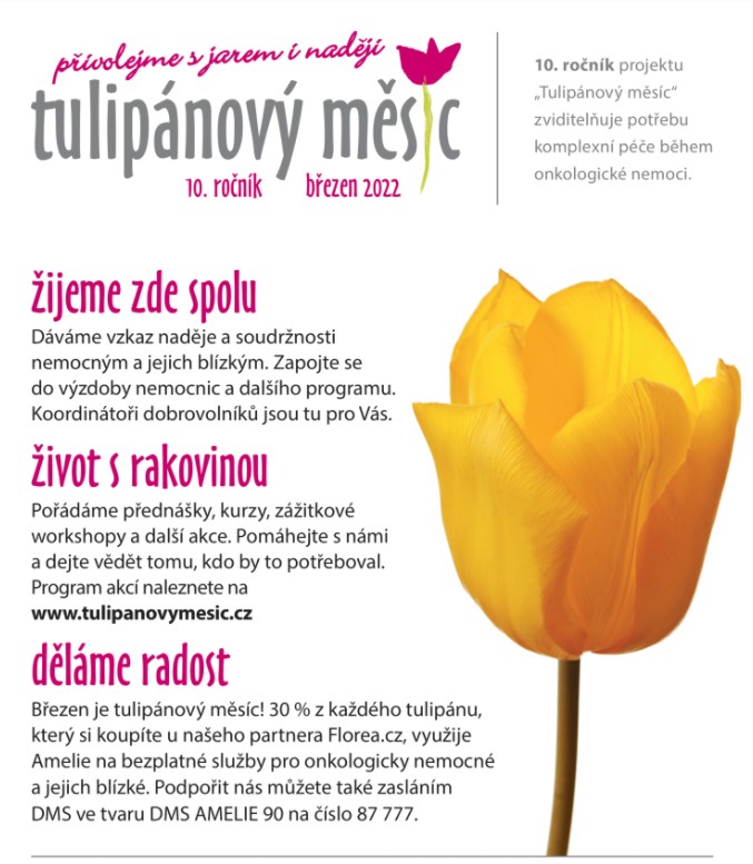 Březen se stal již po desáté měsícem, kdy se mohou zapojit všichni, komu není osud onkologicky nemocných a jejich blízkých lhostejný. Koupí benefiční kytice od Florea.cz na www.amelie-zs.cz/benefice přispějí 30 % z ceny tulipánů na aktivity sdružení Amelie.