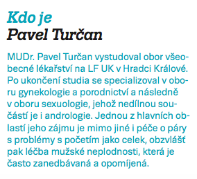 Neplodnost patří mezi jeden z největších problémů 21. století. Jenom v České republice je neplodných něco mezi 15 a 25 % párů a každoročně se jejich počet zvyšuje. Ženské neplodnosti se věnuje větší pozornost a investuje se do ní více prostředků, – zatímco léčba mužské neplodnosti zůstává trochu stranou a tolik se o ní nemluví. Širší veřejnost nemá dostatečné povědomí o možnostech léčby na andrologických a sexuologických klinikách, neexistují žádné státem organizované osvětové programy. K sexuologovi/andrologovi se neplodný muž vydává často až ve chvíli, kdy může být pozdě, a na rozdíl od ženy nedbá tolik na prevenci. Problematiku mužské neplodnosti a s ní spojené mýty časopisu Florence přiblížil sexuolog a gynekolog MUDr. Pavel Turčan.