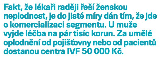 Fakt, že lékaři raději řeší ženskou neplodnost, je do jisté míry dán tím, že jde o komercializaci segmentu. Co se stane, pokud do centra IVF přijde neplodný pár? U muže se zjistí horší spermiogram, ale proč by léčili primárně muže, jehož léčba vyjde na pár tisíc korun a pár by posléze počal přirozenou cestou? Když provedou umělé oplodnění, od pojišťovny nebo od pacientů za něj dostanou 50 000 Kč, což už jsou jiné peníze. Proto se mnohdy nepátrá po pravých příčinách neplodnosti.