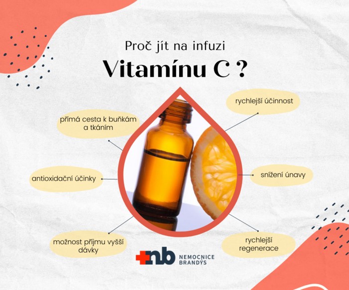 Vitamínová infuzní terapie má zásadní vliv při prevenci onemocnění, při léčbě i rekonvalescenci. Brandýská nemocnice nabízí dva druhy infuzí podávaných nitrožilně. Infuze vitamínu C působí jako přirozená posila vrozené imunitní reakce a funkce mozku. Podporuje také krvetvorbu, vstřebávání železa i hojení ran. Multivitamínová infuzní terapie podporuje nejen obranyschopnost, ale dodává tělu i potřebnou energii. Obsahuje komplex vitamínů B, které jsou nezbytné například pro správnou funkci nervové soustavy, dále působí jako antioxidační ochrana, zlepšuje stav pleti nebo posiluje vlasy a nehty.