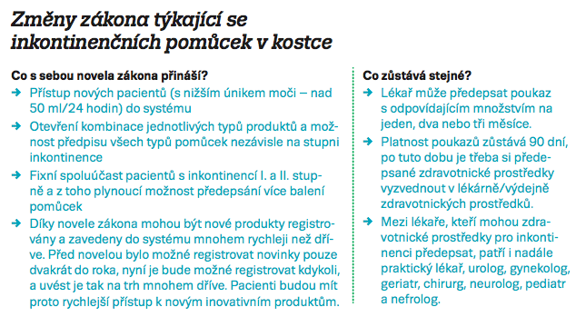 Začátkem prosince 2019 vstoupily v platnost změny zákona č. 48/1997 Sb., o veřejném zdravotním pojištění, upravující výše finančních a kusových limitů na zdravotnické prostředky, které hradí pacientům pojišťovny. Mezi zdravotnické prostředky se řadí i inkontinenční pomůcky. V oblasti úhrad zdravotnických prostředků pro inkontinenci nastávají tři zásadní změny: